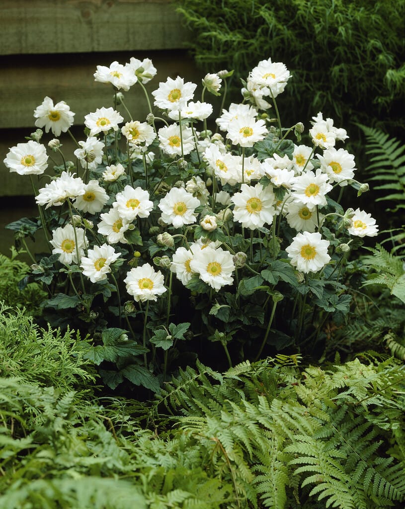 Anemone hybrida Whirlwind gehört zu den Buschwindröschen. Diese mehrjährige Pflanze hat im Herbst weiße Blüten mit einer gelben Mitte. In der Blütezeit erreicht die Anemone eine Höhe von etwa 100 Zentimetern.