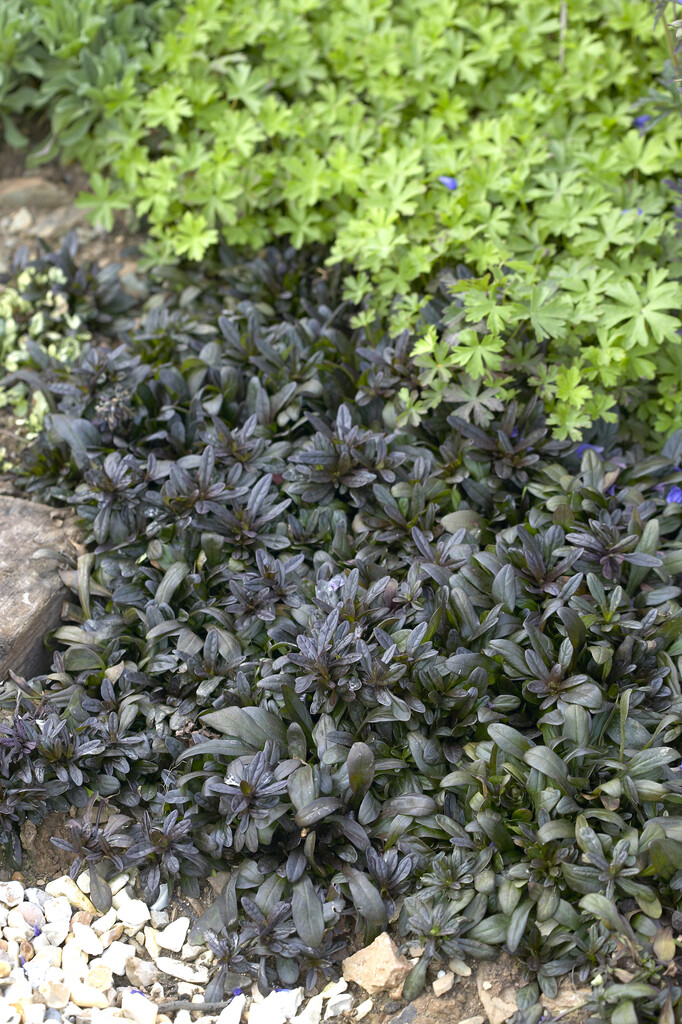 Ajuga reptans 'Chocolate Chip' ist ein pflegeleichter, dekorativer Bodendecker, der mit seinem dunklen Laub und seinen frischen Blüten Ruhe und Struktur in schattige Bereiche des Gartens bringt.