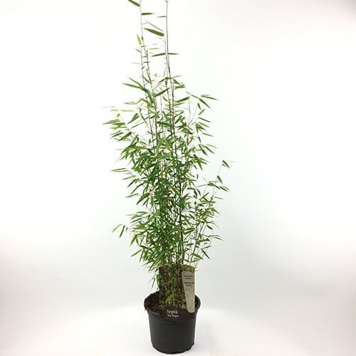 Fargesia ‘Red Dragon’ is een niet-woekerende bamboe die bekendstaat om zijn dichte groei en sierlijke halmen. Deze bamboe is ideaal als haag, groen scherm of solitair element, omdat hij structuur en privacy geeft zonder invasieve worteluitlopers.