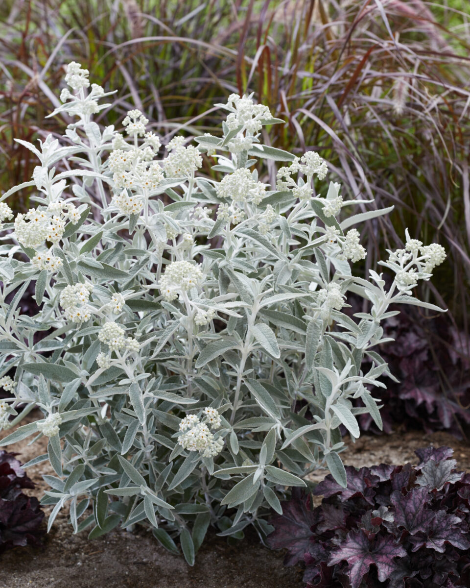 Buddleja davidii ‘Silver Anniversary’ is een onderhoudsarme en elegante vlinderstruik die met zijn zilvergrijze blad en lange bloei kleur en leven brengt in zonnige tuindelen.