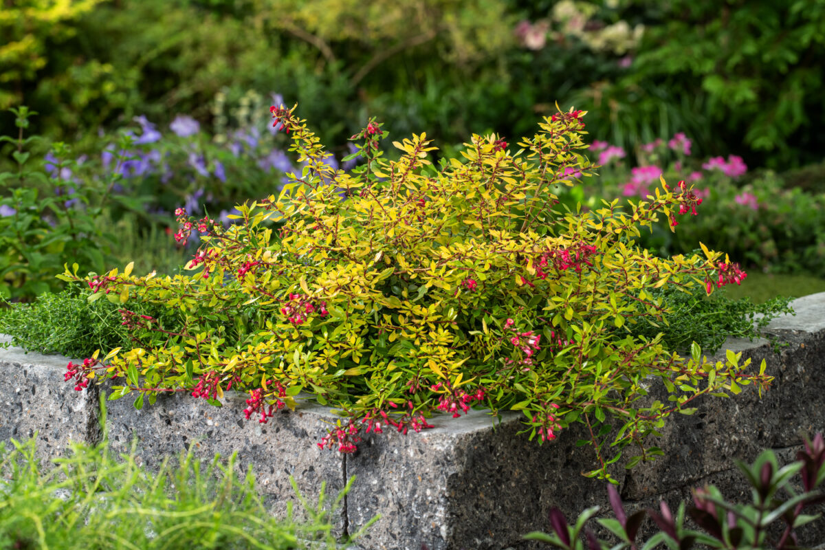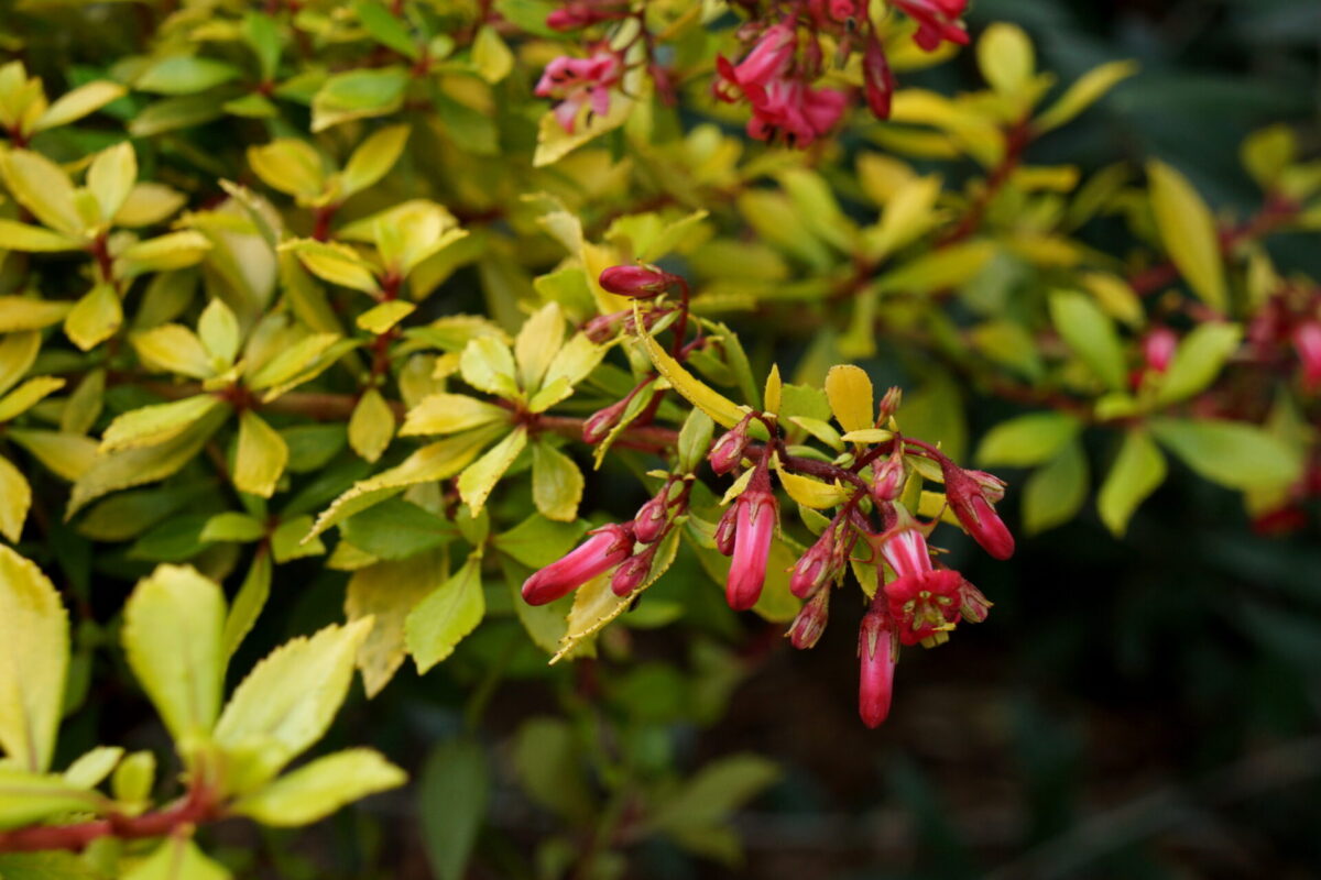 Escallonia hybrid ‘Golden Carpet’ is een sterke, groenblijvende heester die met zijn goudgele blad en zomerse bloei kleur en structuur toevoegt aan borders en randbeplantingen.