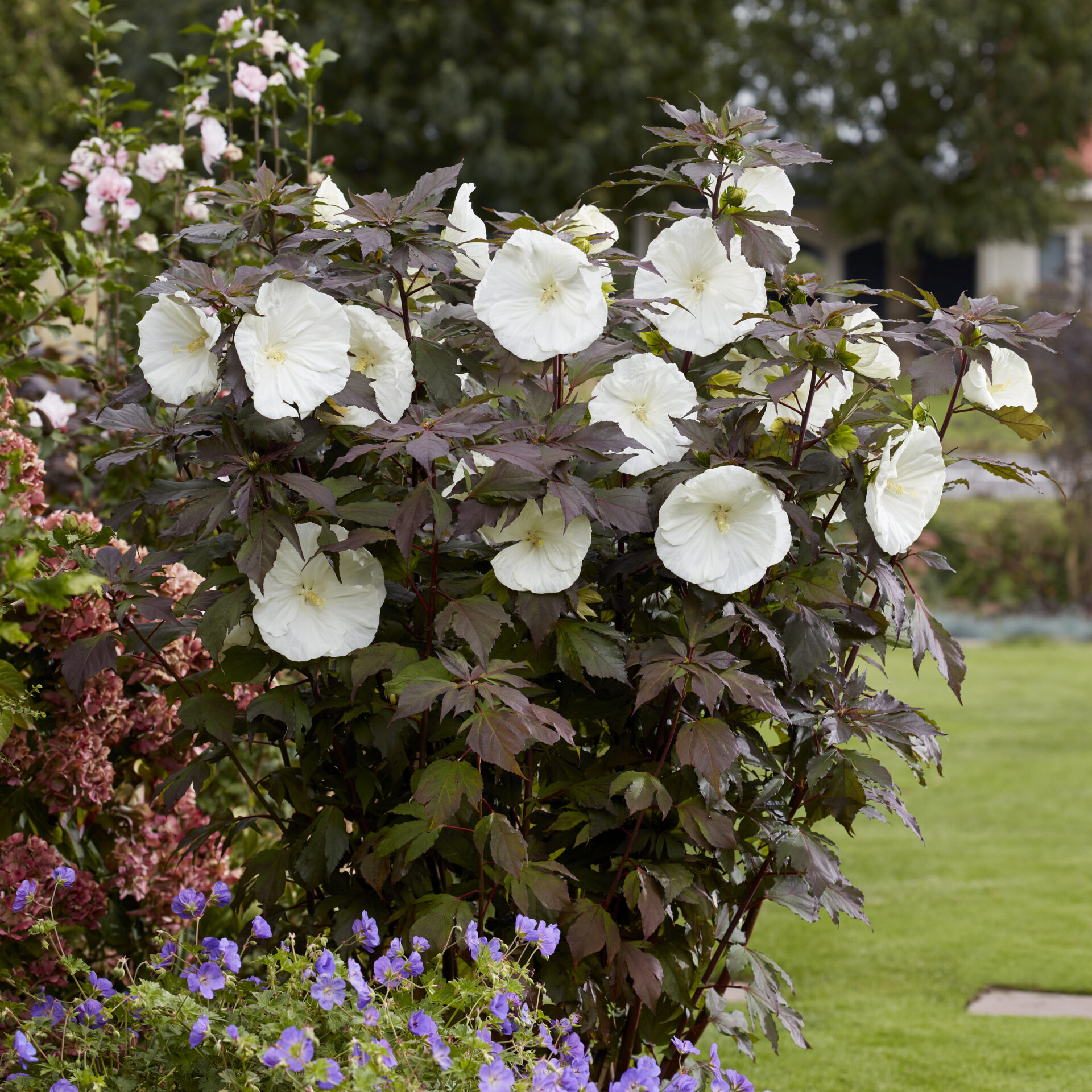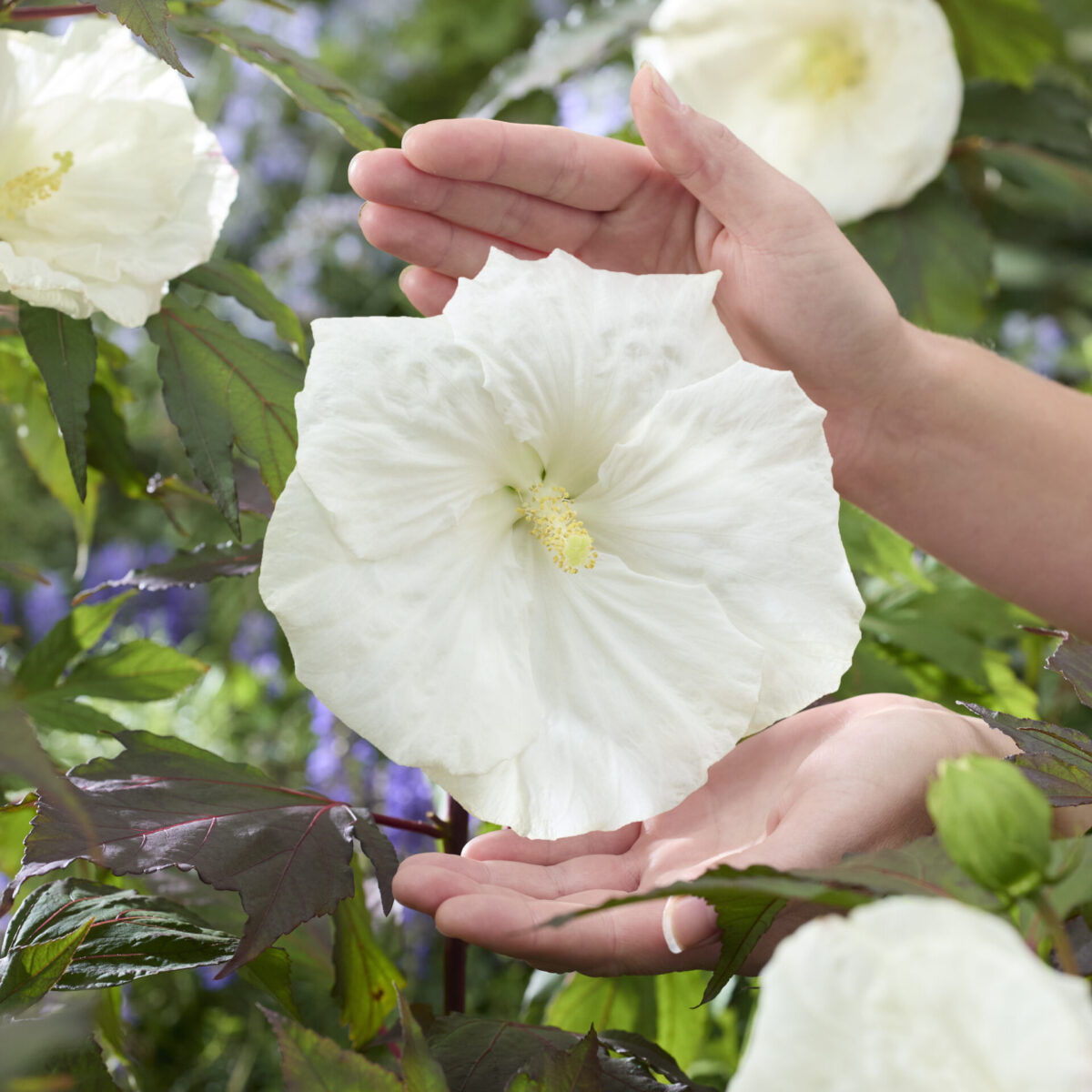 De Hibiscus Carousel ‘Ghost’ is een spectaculaire altheastruik die met haar spookachtig zuiver witte bloemen van 15 tot 18 cm een onvergetelijke indruk maakt in elke zomertuin. Het dramatische contrast met het donkere blad, de onderhoudsvriendelijke groeivorm en de goede winterhardheid maken de Ghost tot de witte ster van de Carousel-serie.