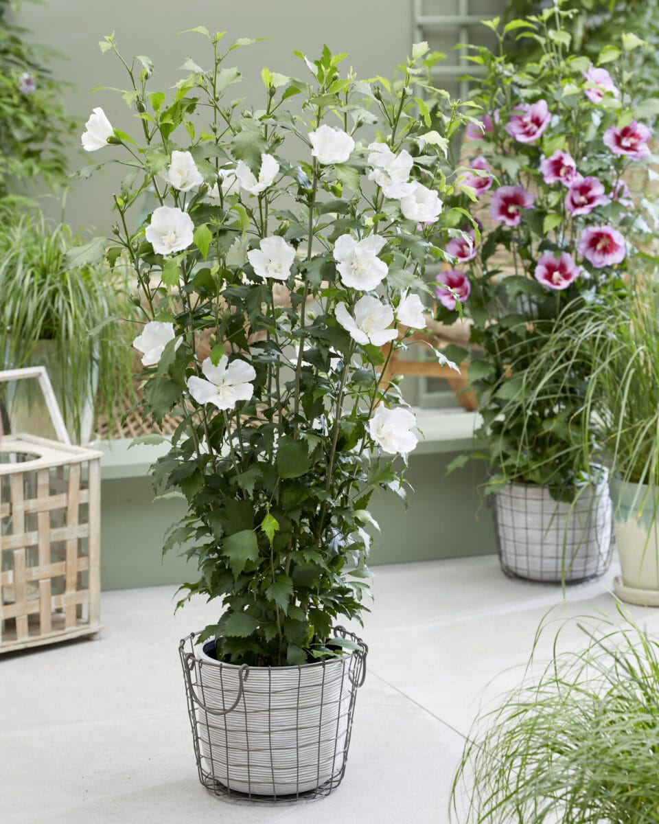 Hibiscus Flower Tower White heeft een smalle, opgaande, zuilvormige groeiwijze en is daarmee zeer geschikt voor de kleinere tuin. Maar met de prachtige witte, half gevulde bloemen is Flower Tower White een aanwinst in elke tuin, op balkon of terras of als haag.
