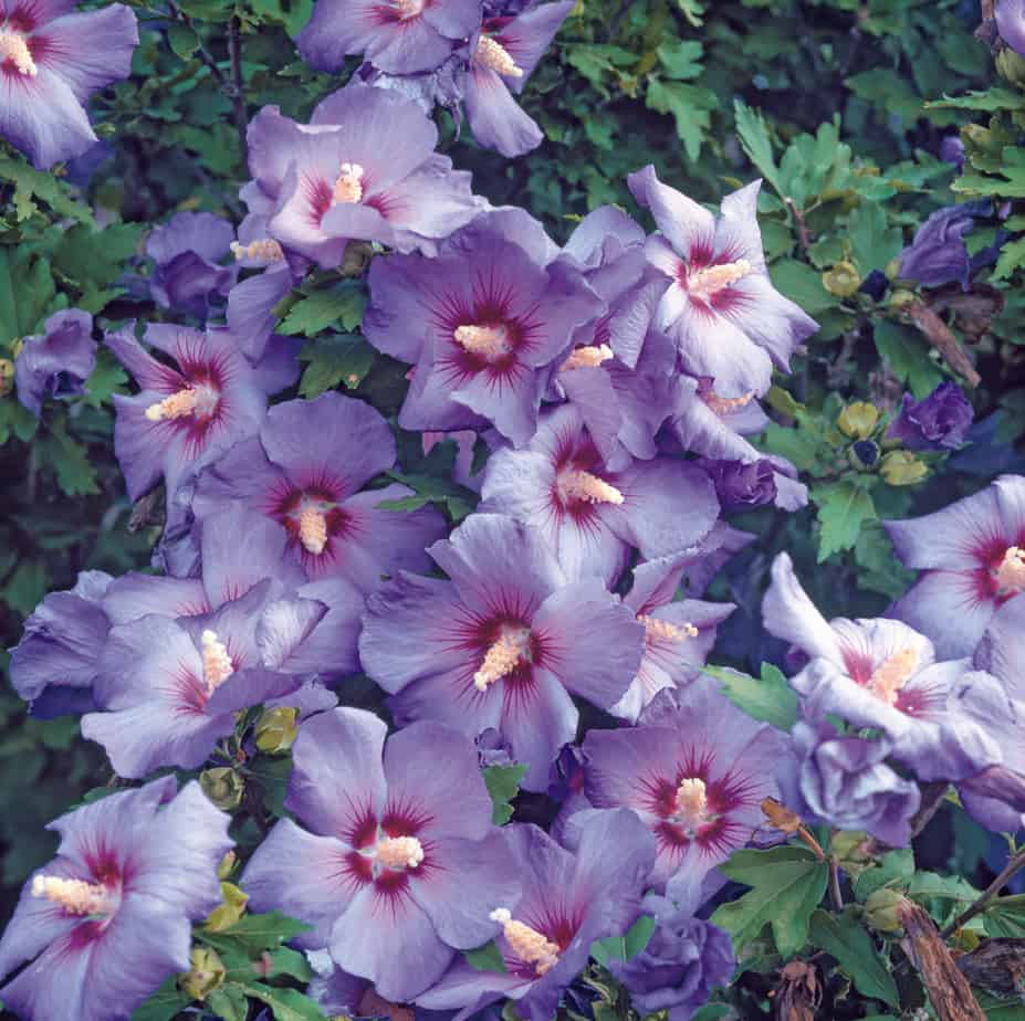 Hibiscus syriacus ‘Oiseau Blue’ is een rijkbloeiende altheastruik met opvallende bloemen die langdurig kleur en structuur aan de tuin geeft.