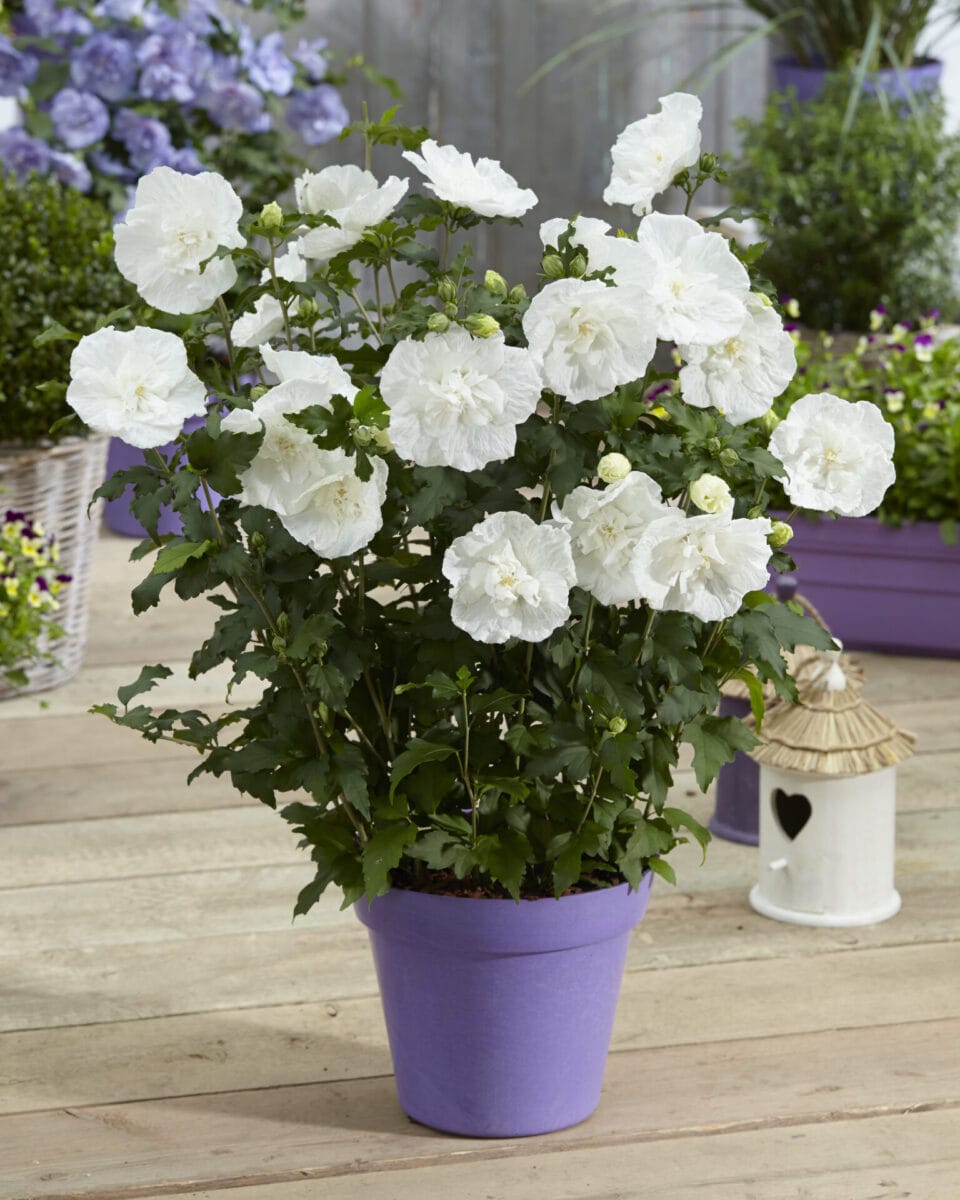 ● Hibiscus White Chiffon bloeit rijkelijk met witte bloemen die in contrast met het intens groene blad een lust voor het oog zijn.