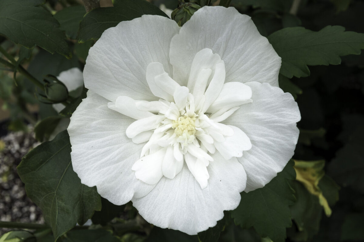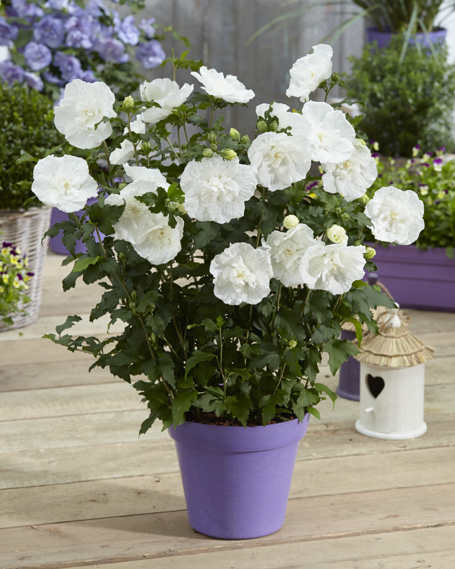 Hibiscus syriacus ‘White Chiffon’ is een gracieuze en rijkbloeiende struik die met zijn lichte bloemen en langdurige bloei sfeer en elegantie brengt in zonnige tuinen.