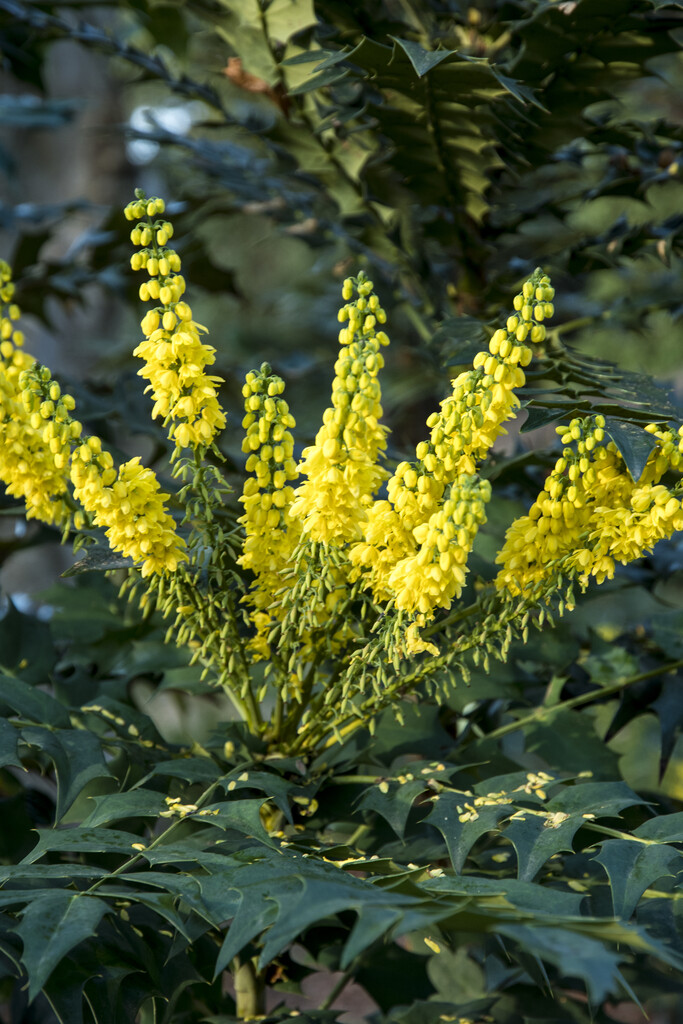 Mahonia media ‘Winter Sun’ is een robuuste, groenblijvende heester die met zijn gele bloempluimen een vrolijk accent geeft aan schaduwrijke delen van de tuin.