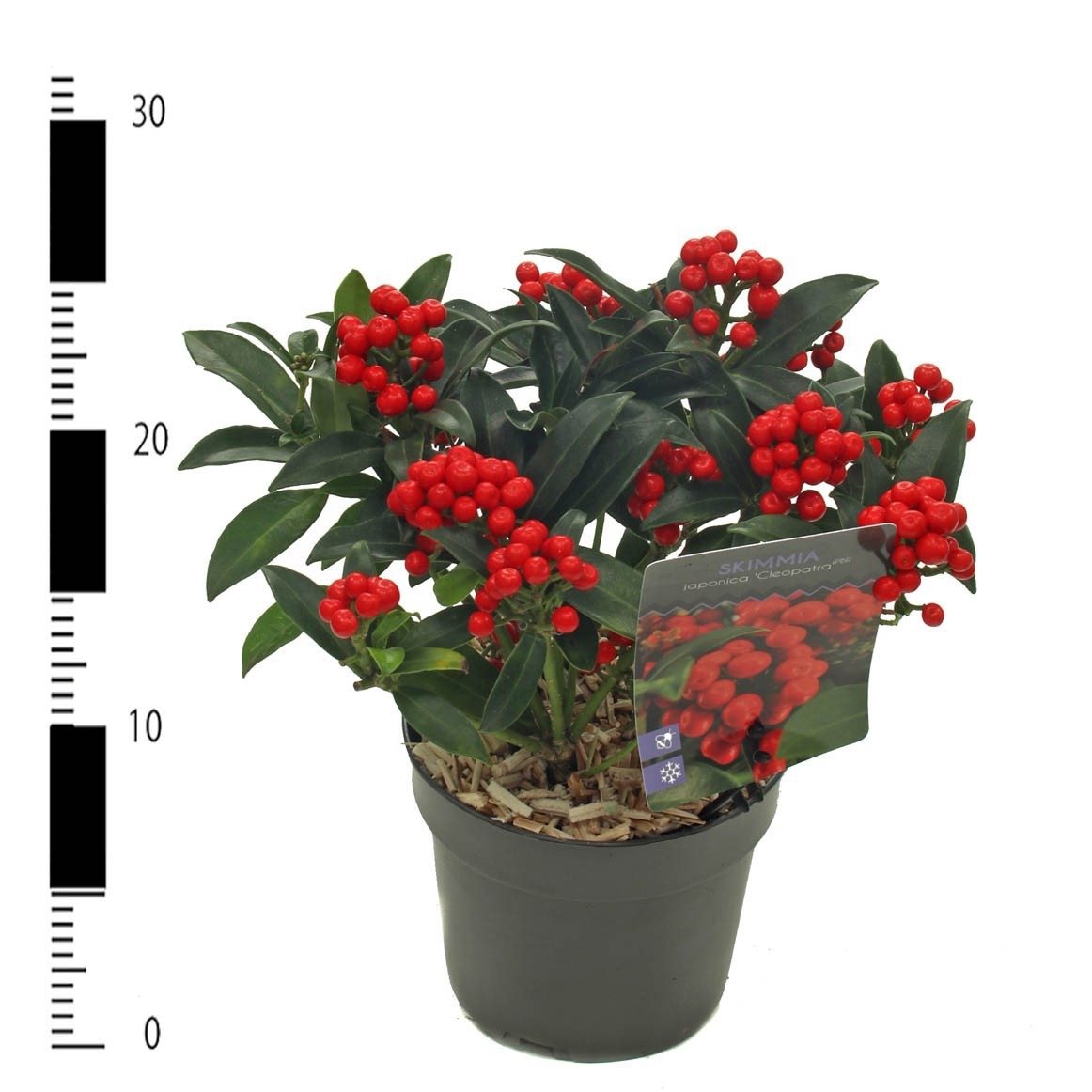 De Skimmia japonica ‘Cleopatra’ is verkrijgbaar in een compacte potmaat. De plant groeit langzaam en compact. De bloei valt in het voorjaar met witte, geurende bloemen. De rode bessen verschijnen van oktober tot februari. De plant is wintergroen en goed winterhard.