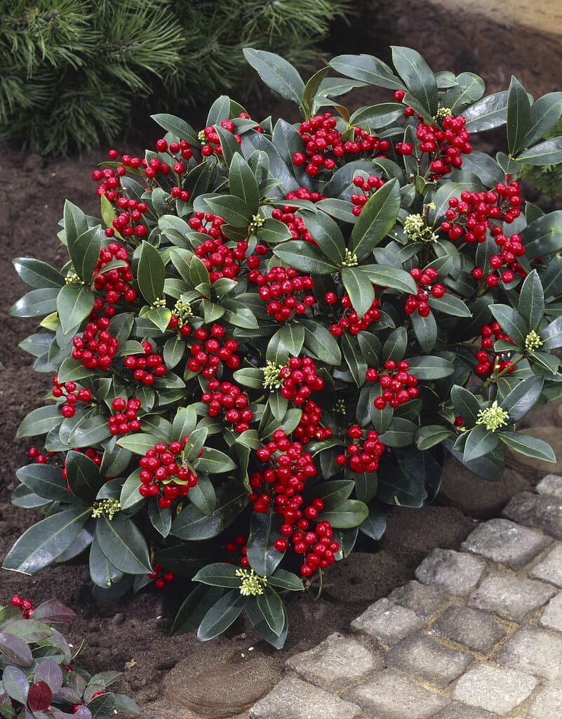 De Skimmia japonica ‘Reevesiana’ is een geliefde, compact groeiende sierheester met prachtige kenmerken. Zo heeft de heester lancetvormige, glanzende, donkergroene bladeren, die het hele jaar aan de wintergroene Skimmia blijven zitten. Daarnaast bloeit de blikvanger van april tot en met juni met witte, geurende bloempluimen. Hierna worden witgroene bessen gevormd, die van oktober tot februari prachtig rood zijn. De felrode bessen zijn een fantastische aanwinst voor in de kersttijd en bovendien een goede voedselbron voor vogels. In combinatie met de donkergroene bladeren zorgt de Skimmia voor kleur in de wintertuin, wanneer veel andere bomen en planten in ruststand zijn. De Skimmia japonica ‘Reevesiana’ is een eenhuizige soort, wat inhoudt dat er bloemen en bessen aan één plant gevormd worden. Met deze sierheester geniet je dus dubbelop! De langzaam groeiende Skimmia ‘Reevesiana’ wordt ongeveer 50 tot 60 cm hoog en is geschikt voor in de border, voor op het terras of balkon in een pot of kuip, of onder bomen en grote heesters. De Skimmia houdt namelijk van een standplaats in de (half) schaduw. Daarnaast verkiest de sierheester een (licht) vochtige, zure, humusrijke grond. De Skimmia japonica ‘Reevesiana’ is winterhard en makkelijk te verzorgen, en daardoor geschikt voor mensen met en zonder groene vingers.