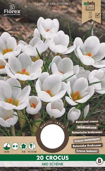 Crocus ‘Ard Schenk’ is een vroegbloeiende krokus met zuiverwitte bloemen die al in het vroege voorjaar verschijnen. Deze botanische krokus zorgt voor een fris en helder accent in borders, grasvelden, rotstuinen en potten. Door de lage groei en vroege bloei is deze krokus ideaal om het tuinseizoen op een lichte en elegante manier te openen.