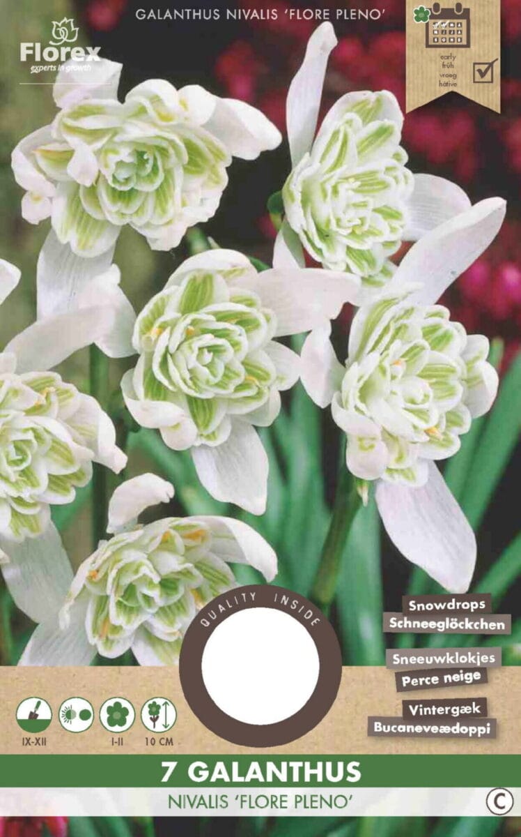 Galanthus nivalis ‘Flore Pleno’ is een set van zeven bloembollen van de gevulde sneeuwklokjes die vroeg in het voorjaar een elegante en frisse uitstraling geven aan de tuin. Deze klassieke voorjaarsbloeiers vormen charmante clusters van tere, witte bloemen die boven het frisse blad uitsteken zodra de winter zijn einde nadert. Door hun vroege bloei zijn sneeuwklokjes een geliefde keuze om kleur en leven terug te brengen in het tuinseizoen.