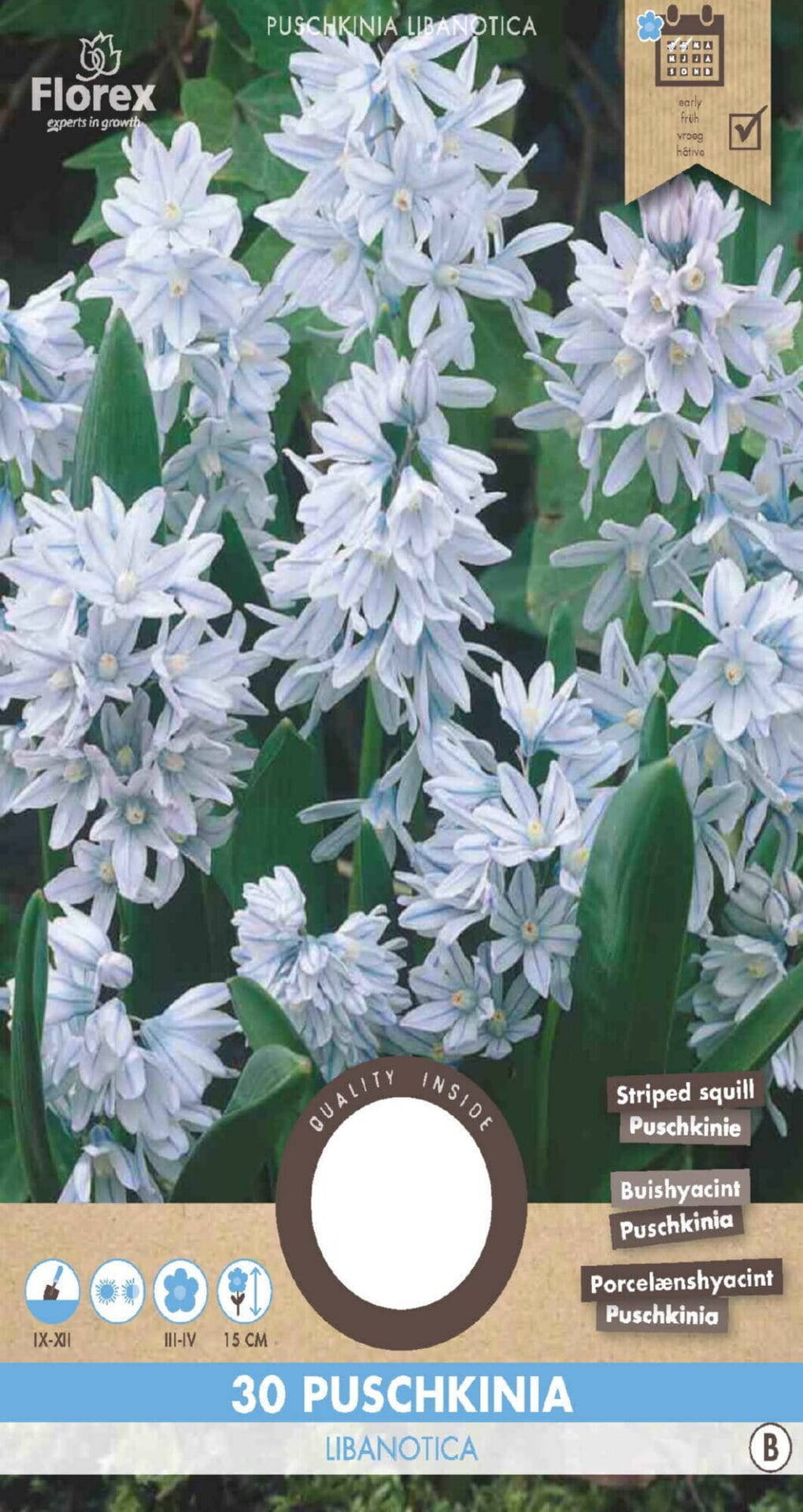 De Puschkinia libanotica bloembollen vormen een prachtige aanvulling in het vroege voorjaar met elegante, lichtblauwe bloemen met witte accenten. De set van 30 bloembollen geeft een weelderig en speels beeld in borders, grasvelden, rotstuinen en potculturen wanneer de winter overgaat in de lente.
