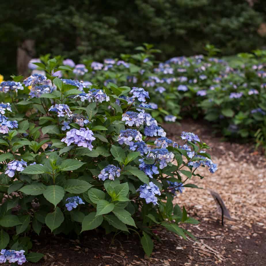 Hydrangea macrophylla ‘Twist ’n Shout Blue’ kan na de bloei licht worden gesnoeid om vorm te behouden. Verwijder verwelkte bloemschermen om het geheel netjes te houden.