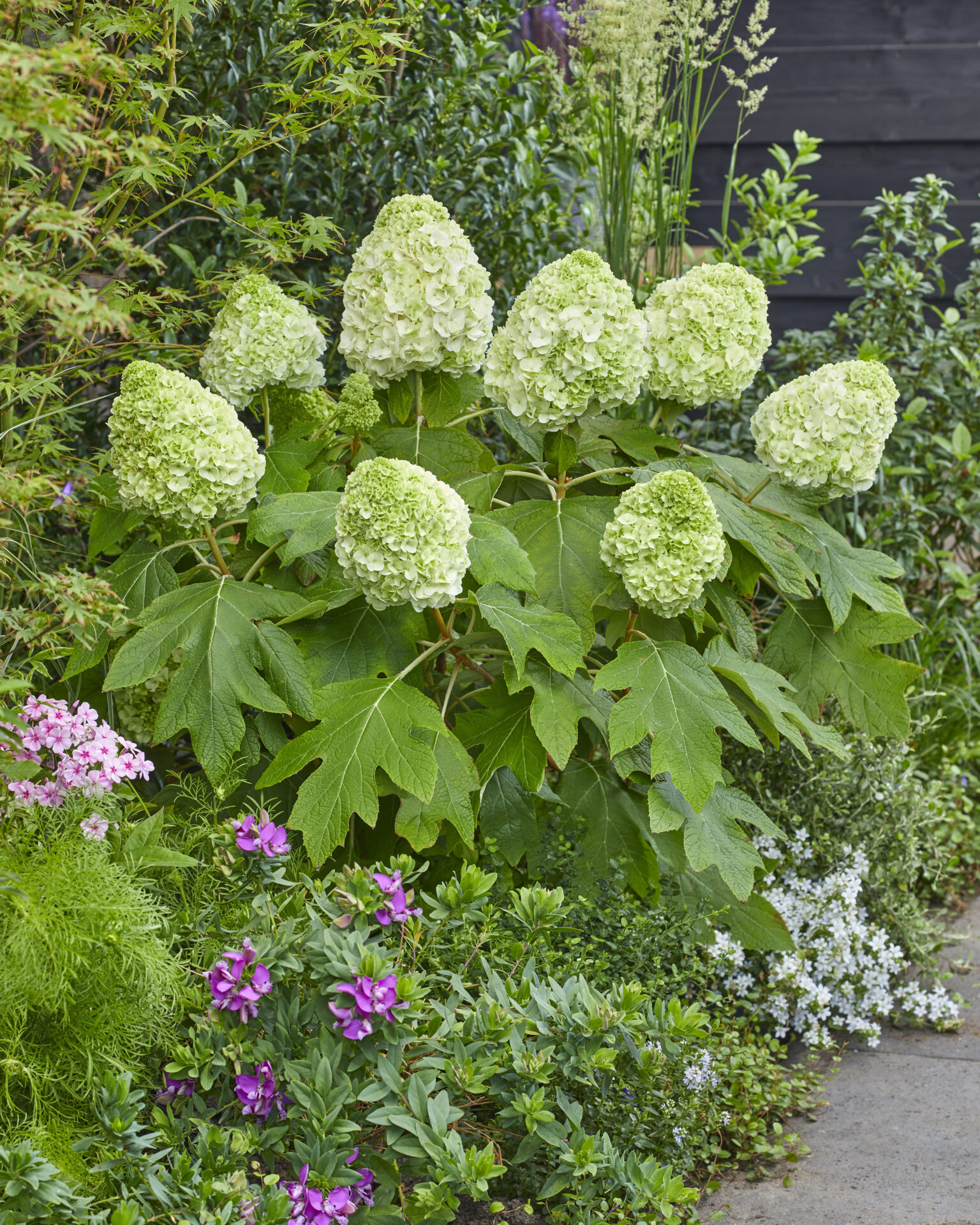 De Hydrangea quercifolia ‘Tara’ is een compacte eikenbladhortensia die alle seizoenspracht van haar grotere familieleden biedt in een handzaam formaat. Witte zomerbloei, spectaculaire rode herfstverkleuring en een grafisch wintersilhouet: de Tara bewijst dat groot effect ook in compact formaat kan komen.