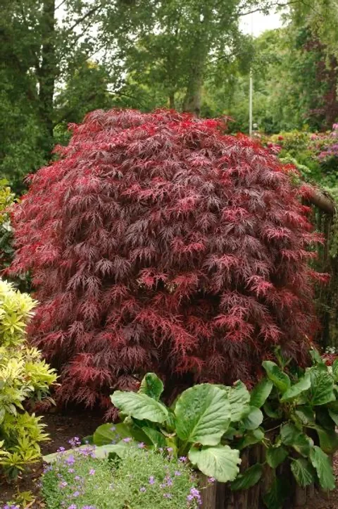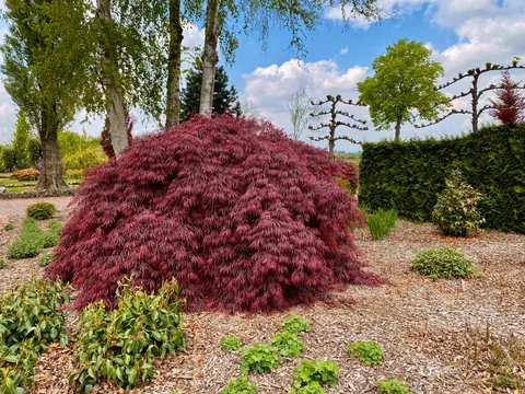 Acer palmatum ‘Garnet’ is een elegante Japanse esdoorn die met zijn verfijnde blad en diepe kleur een rustgevend en stijlvol accent vormt in de tuin.