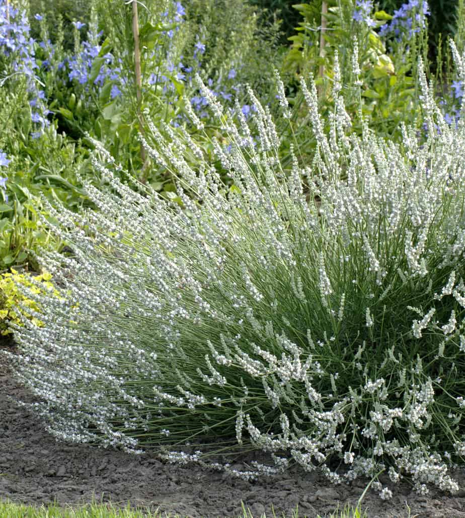 Lavandula angustifolia ‘Edelweiss’ is winterhard in gematigde klimaten. In de winter kan een lichte mulchlaag helpen om wortels te beschermen, maar in het voorjaar loopt de plant gewoon weer fris uit.