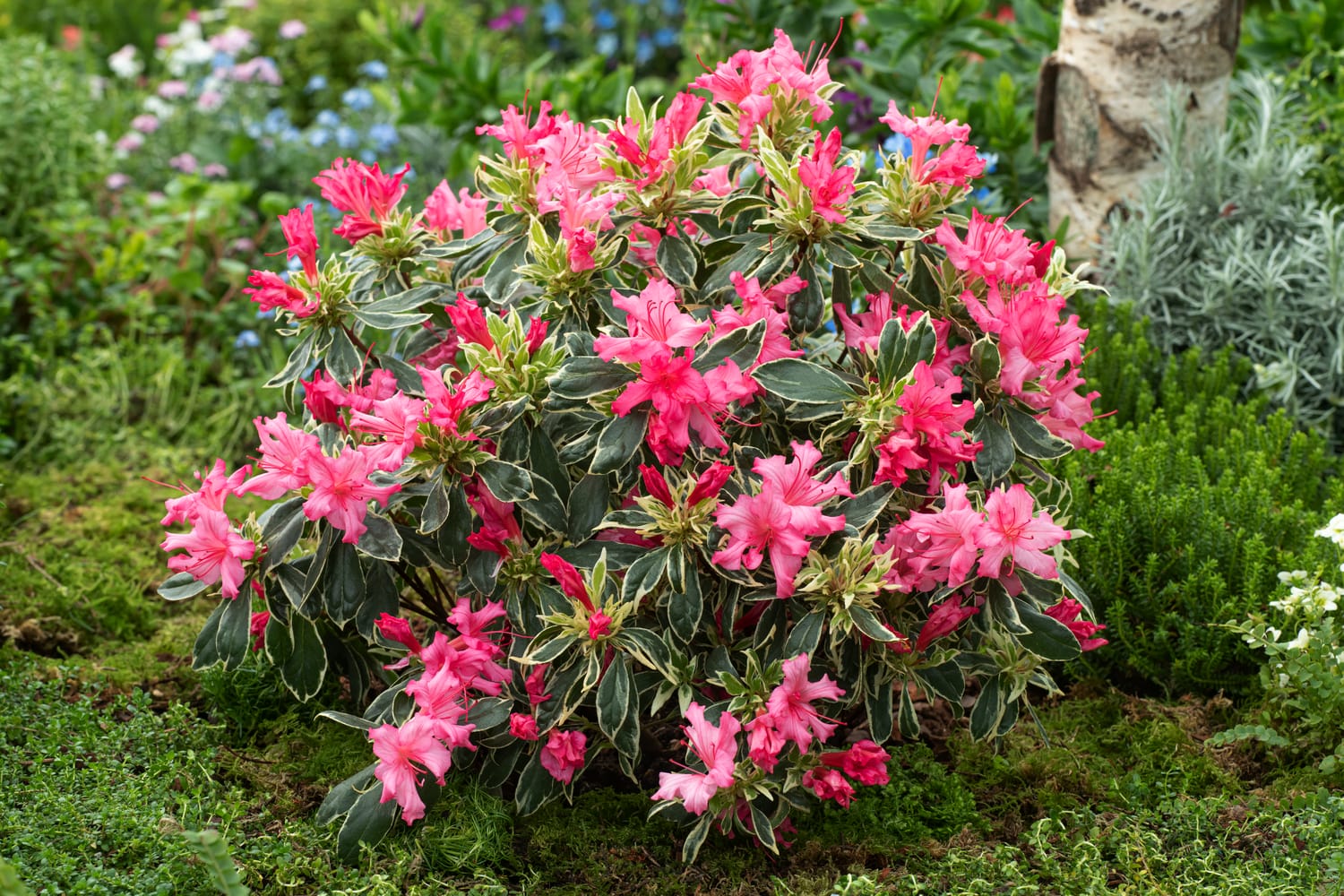 Rhododendron Bollywood is bontbladige Dwergrhododendron, deze wordt maximaal 75 centimeter hoog. De Rhododendron Bollywood bloeit in de periode rond mei en juni met roze bloemen.