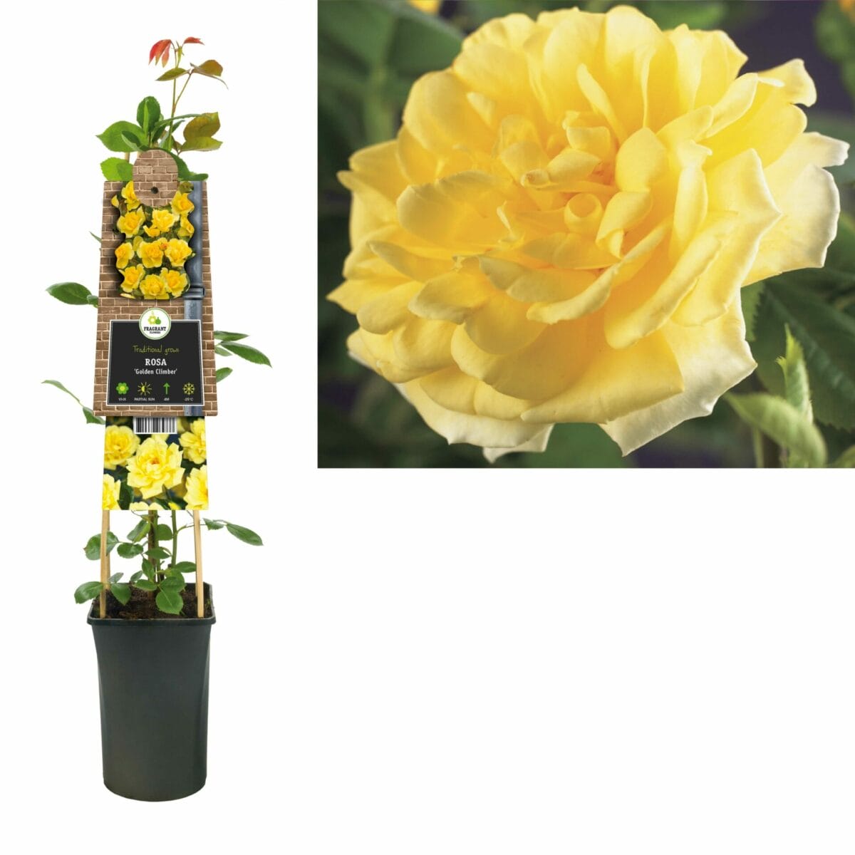 Rosa ‘Golden Climber’ is een vrolijke klimroos met een rijke bloei van warme, goudgele bloemen die een zonnig accent geven aan pergola’s, muren en schuttingen. Deze roos combineert langdurige bloei met een krachtige groeivorm, wat hem ideaal maakt voor verticale beplanting en romantische tuinbeelden. Door zijn levendige kleur en geurige bloemen is hij een geliefde keuze voor tuinen waar kleur en hoogte gewenst zijn.