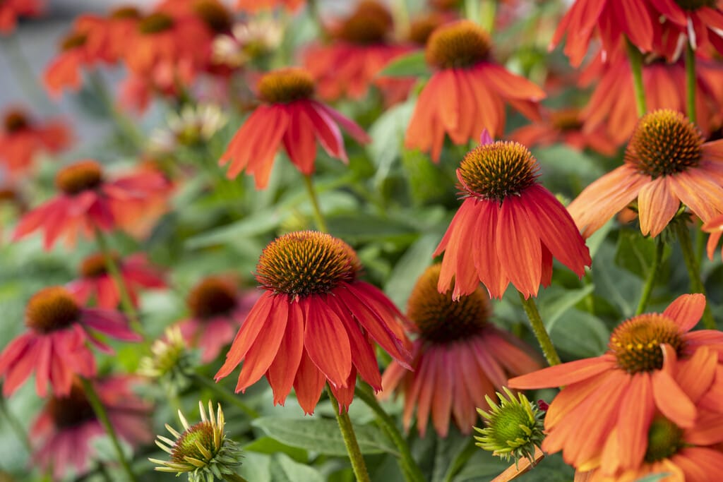 Echinacea purpurea ‘Lakota Orange’ is een kleurrijke en robuuste zonnehoed die met zijn warme bloemen sfeer en leven brengt in zonnige tuinen.