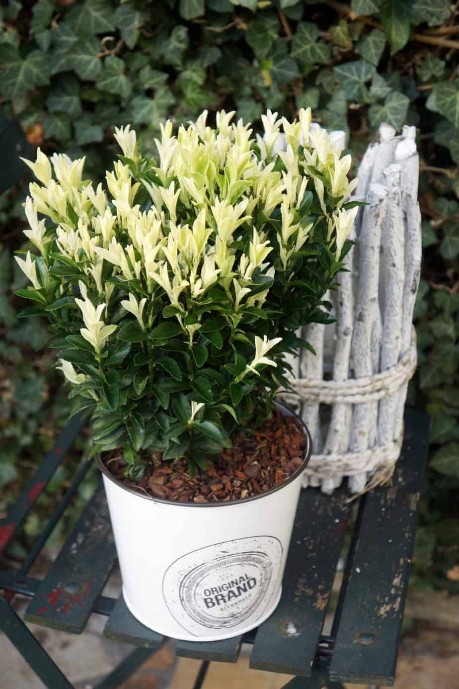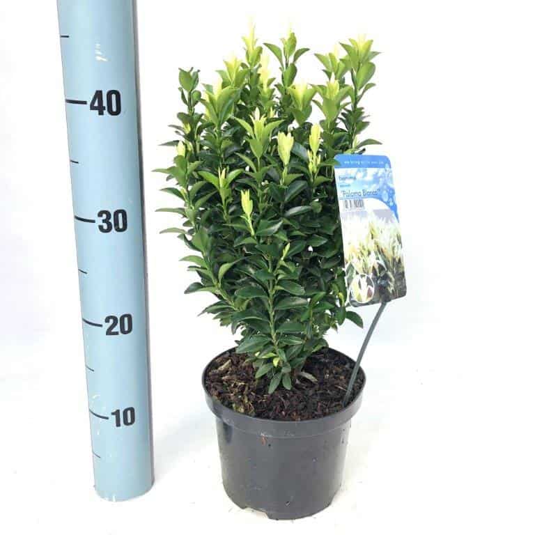 Euonymus japonicus ‘Paloma Blanca’ (kardinaalsmuts) is een compacte, wintergroene heester die vooral opvalt door zijn opvallende kleurenspel. In het vroege voorjaar verschijnen nieuwe scheuten in een helder witte tot parelmoerkleurige tint, wat een opvallend contrast vormt met het donkergroene volwassen blad. Deze lichte scheuten blijven enkele maanden decoratief voordat ze verkleuren naar donkergroen. Dankzij zijn compacte groei blijft de plant ongeveer 75 cm hoog en breed, waardoor hij ideaal is als lage haag, vormstruik of solitair in een pot.