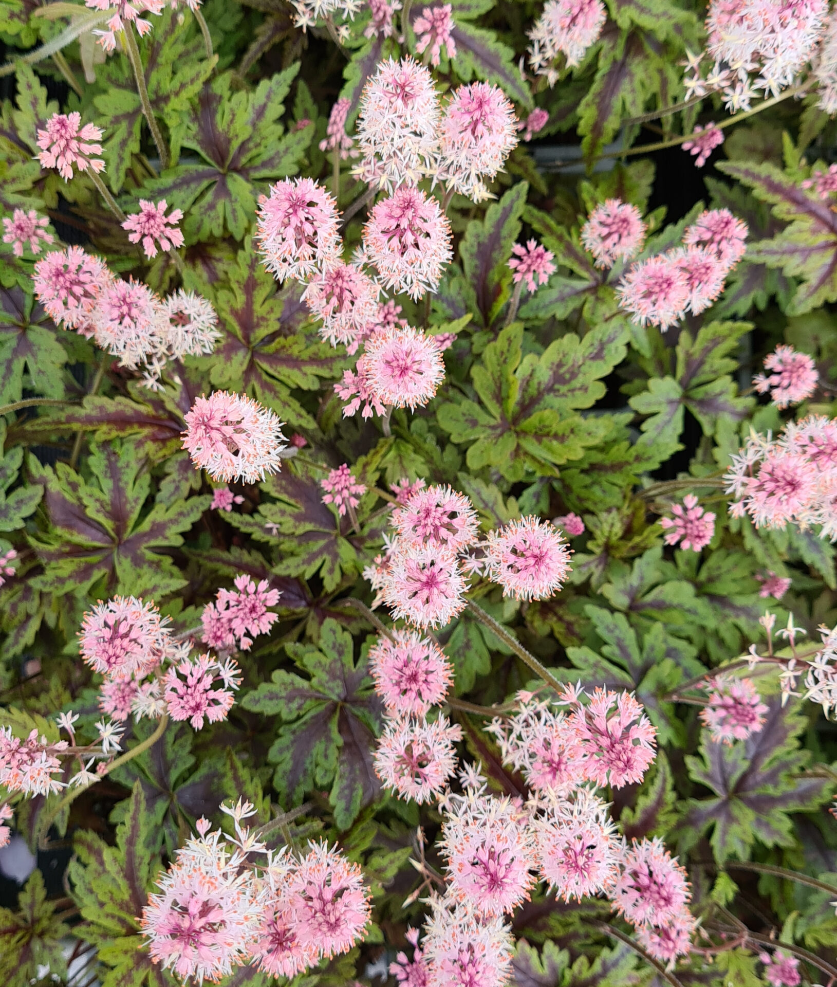Het meest onderscheidende aan de Angel Wings is de combinatie van diep ingesneden, engelenvleugelvormig blad met een donkere, centrale bladtekening. De bladeren zijn fijner en dieper ingesneden dan bij de meeste andere Tiarella-cultivars, wat een luchtige, verfijnde textuur geeft. De donkerbruine tot rode bladvlekken langs de nerven creëren een opvallend patroon dat de plant ook buiten de bloeiperiode decoratief maakt. De schuimende witte bloemaren in het voorjaar zijn een elegante bonus.