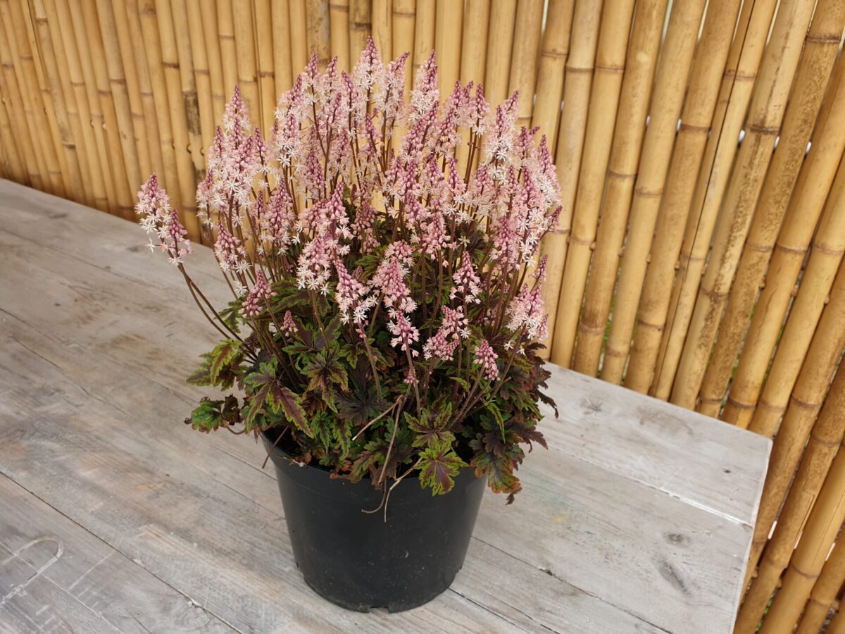 De Tiarella ‘Angel Wings’ (schuimkaars) is verkrijgbaar in een compacte potmaat. De plant bereikt een hoogte van circa 25 cm. De bladeren zijn diep ingesneden met een donkere centrale tekening. De bloei valt in april en mei met witte, licht geurende bloemaren. Halfwintergroen en goed winterhard.